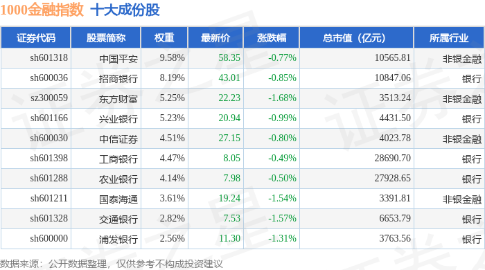 证券之星消息,12月3日,1000金融(399387)指数报收于5498.08点,跌0.92%,成交531.31亿元,换手率0.34%。当日该指数成份股中,上涨的有11家,中粮资本以2.09%的涨幅领涨,下跌的有82家,天风证券以3.2%的跌幅领跌。