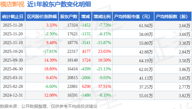 从股价来看,2025年11月10日至2025年11月28日,横店影视区间涨幅为3.33%,在此期间股东户数减少1452.0户,减幅为7.73%。