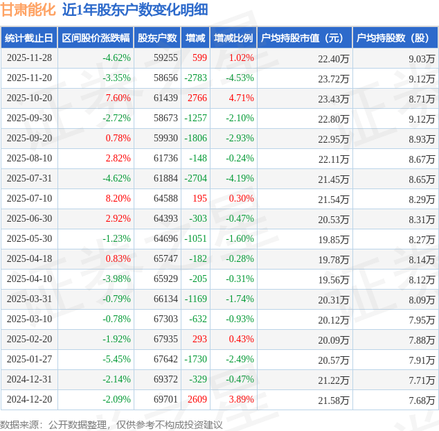 从股价来看,2025年11月20日至2025年11月28日,甘肃能化区间跌幅为4.62%,在此期间股东户数增加599.0户,增幅为1.02%。