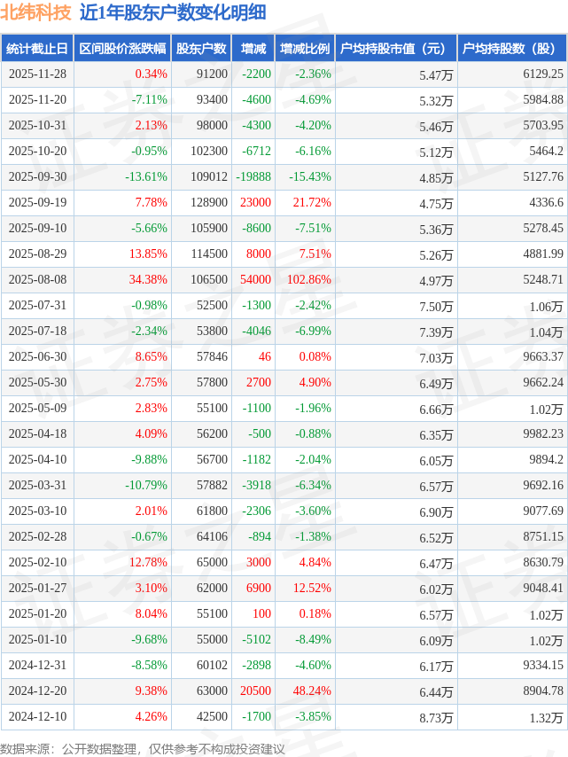 从股价来看,2025年11月20日至2025年11月28日,北纬科技区间涨幅为0.34%,在此期间股东户数减少2200.0户,减幅为2.36%。
