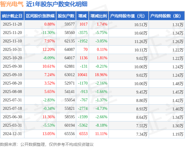 从股价来看,2025年11月20日至2025年11月28日,智光电气区间涨幅为0.88%,在此期间股东户数增加1017.0户,增幅为1.74%。