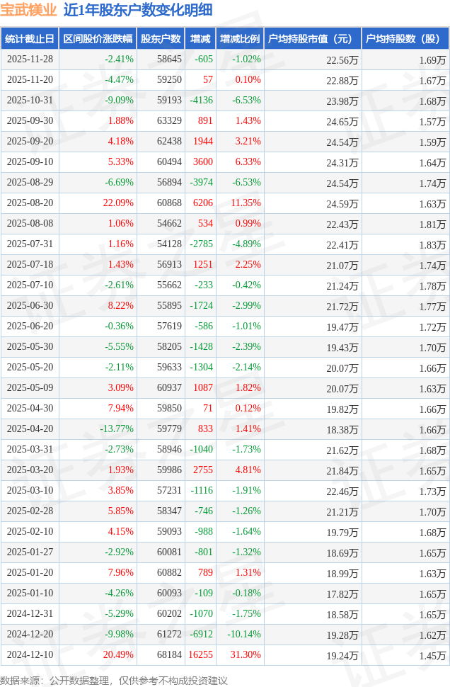 从股价来看,2025年11月20日至2025年11月28日,宝武镁业区间跌幅为2.41%,在此期间股东户数减少605.0户,减幅为1.02%。
