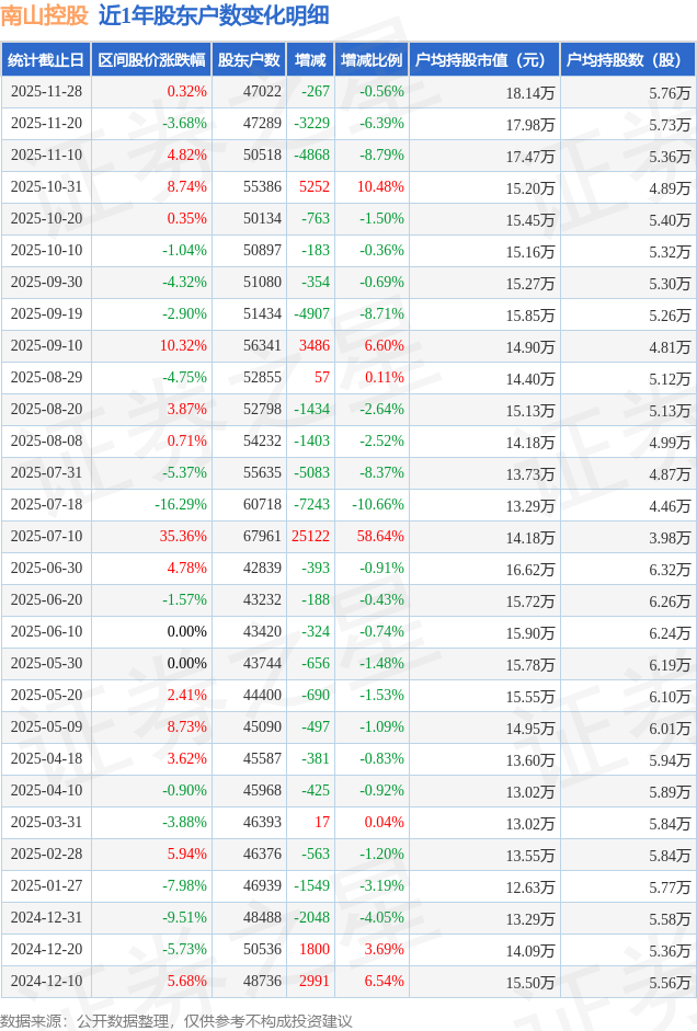 从股价来看,2025年11月20日至2025年11月28日,南山控股区间涨幅为0.32%,在此期间股东户数减少267.0户,减幅为0.56%。