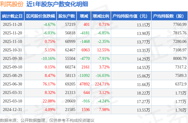 从股价来看,2025年11月20日至2025年11月28日,利民股份区间跌幅为4.67%,在此期间股东户数增加401.0户,增幅为0.71%。