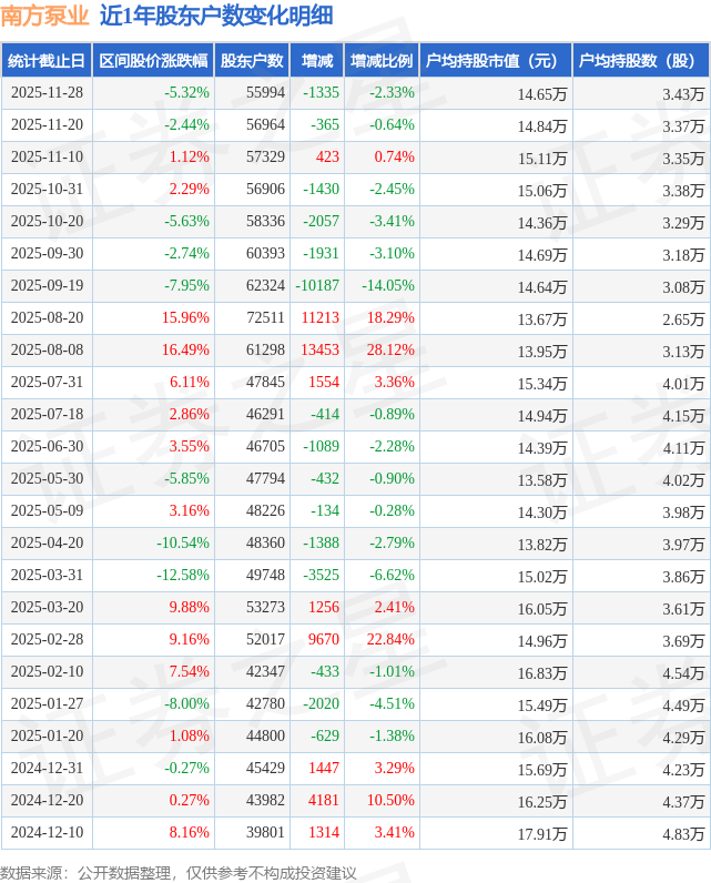 从股价来看,2025年11月10日至2025年11月28日,南方泵业区间跌幅为5.32%,在此期间股东户数减少1335.0户,减幅为2.33%。
