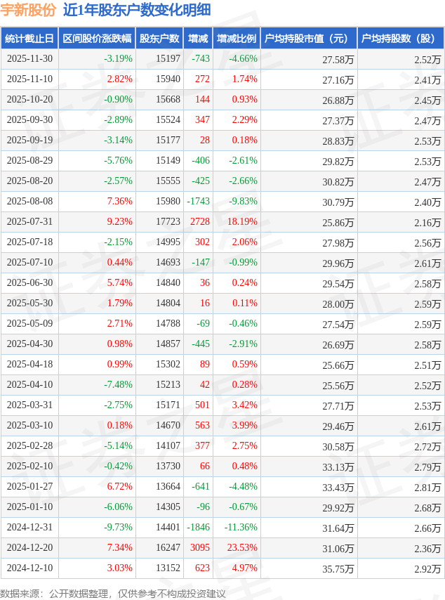 从股价来看,2025年11月10日至2025年11月30日,宇新股份区间跌幅为3.19%,在此期间股东户数减少743.0户,减幅为4.66%。
