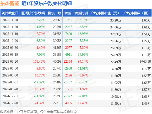 从股价来看,2025年11月20日至2025年11月28日,东杰智能区间跌幅为2.22%,在此期间股东户数减少931.0户,减幅为3.15%。
