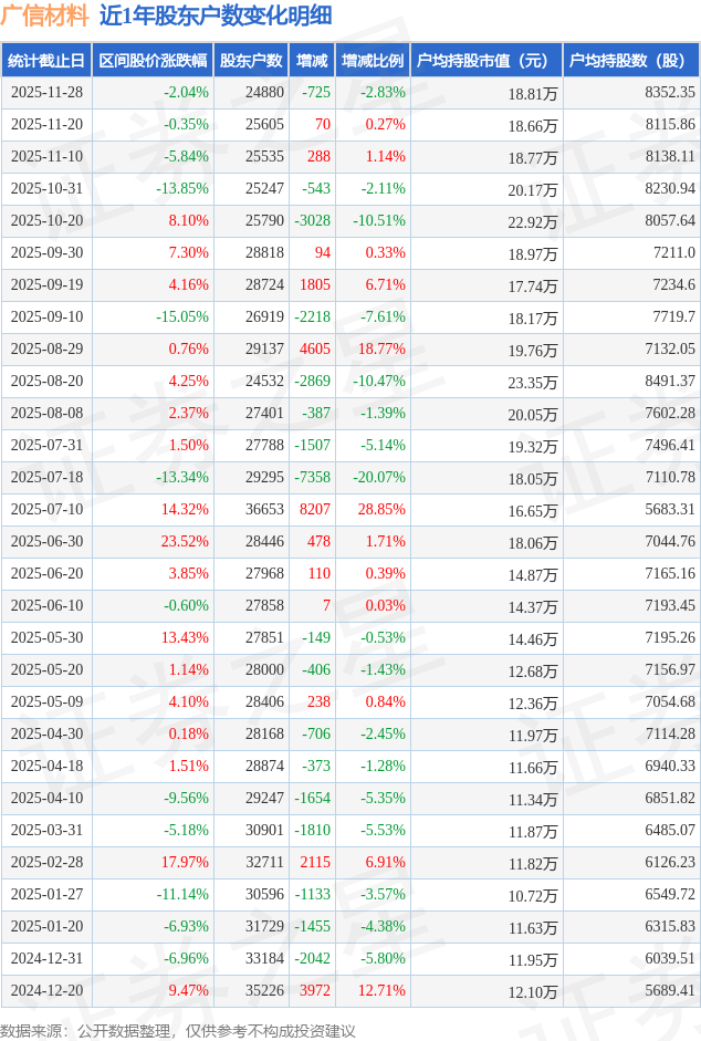 从股价来看,2025年11月20日至2025年11月28日,广信材料区间跌幅为2.04%,在此期间股东户数减少725.0户,减幅为2.83%。