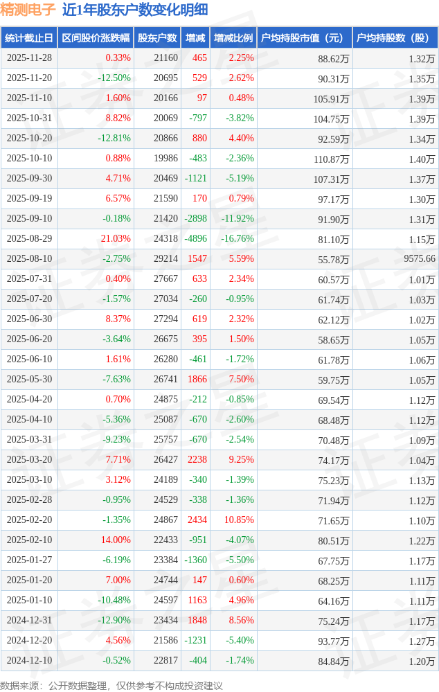 从股价来看,2025年11月20日至2025年11月28日,精测电子区间涨幅为0.33%,在此期间股东户数增加465.0户,增幅为2.25%。