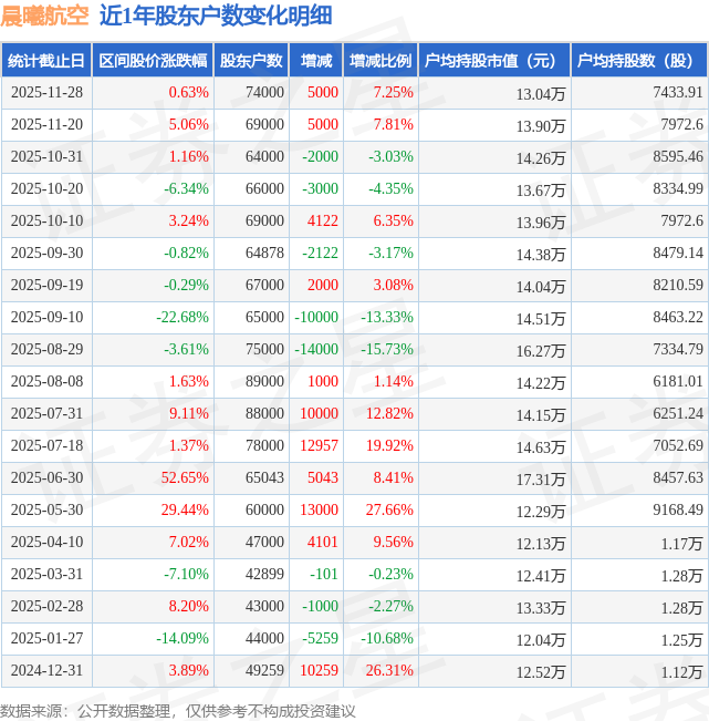 从股价来看,2025年11月20日至2025年11月28日,晨曦航空区间涨幅为0.63%,在此期间股东户数增加5000.0户,增幅为7.25%。