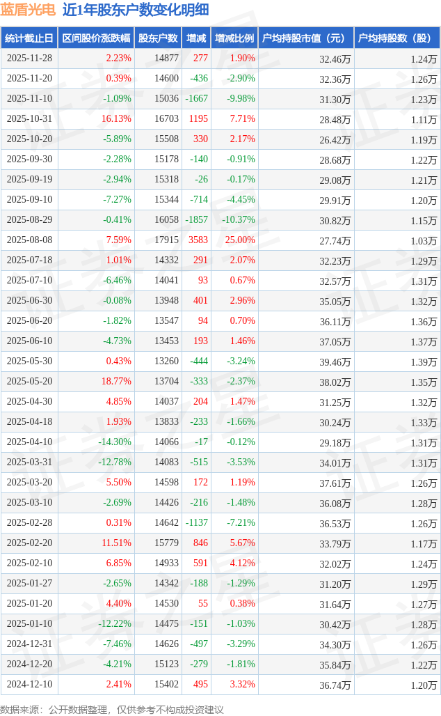 从股价来看,2025年11月20日至2025年11月28日,蓝盾光电区间涨幅为2.23%,在此期间股东户数增加277.0户,增幅为1.9%。