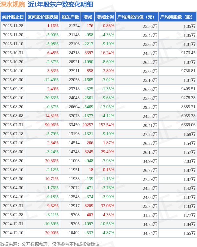 从股价来看,2025年11月20日至2025年11月28日,深水规院区间涨幅为1.16%,在此期间股东户数增加176.0户,增幅为0.83%。