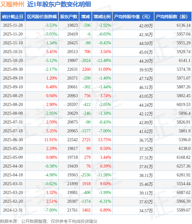 从股价来看,2025年11月20日至2025年11月28日,义翘神州区间跌幅为3.53%,在此期间股东户数减少596.0户,减幅为2.92%。