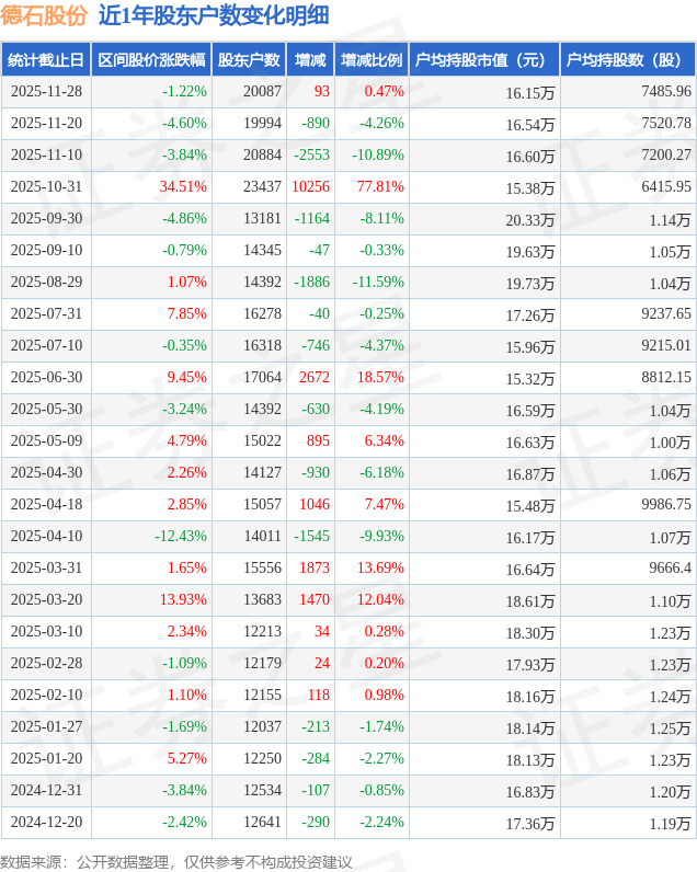 从股价来看,2025年11月20日至2025年11月28日,德石股份区间跌幅为1.22%,在此期间股东户数增加93.0户,增幅为0.47%。