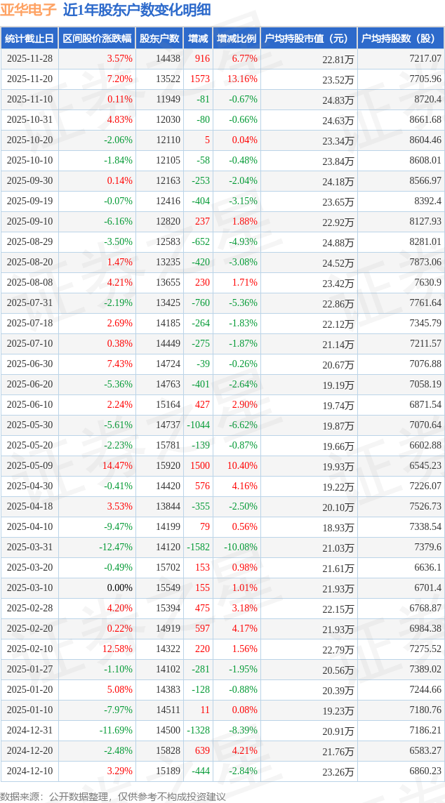 从股价来看,2025年11月20日至2025年11月28日,亚华电子区间涨幅为3.57%,在此期间股东户数增加916.0户,增幅为6.77%。