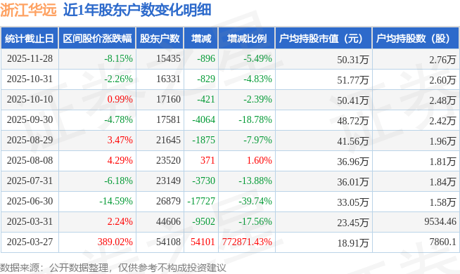 从股价来看,2025年10月31日至2025年11月28日,浙江华远区间跌幅为8.15%,在此期间股东户数减少896.0户,减幅为5.49%。