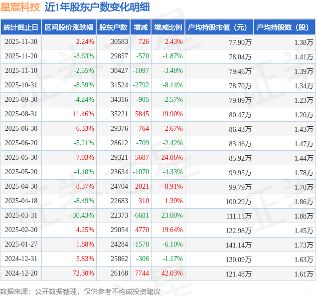 从股价来看,2025年11月20日至2025年11月30日,星宸科技区间涨幅为2.24%,在此期间股东户数增加726.0户,增幅为2.43%。
