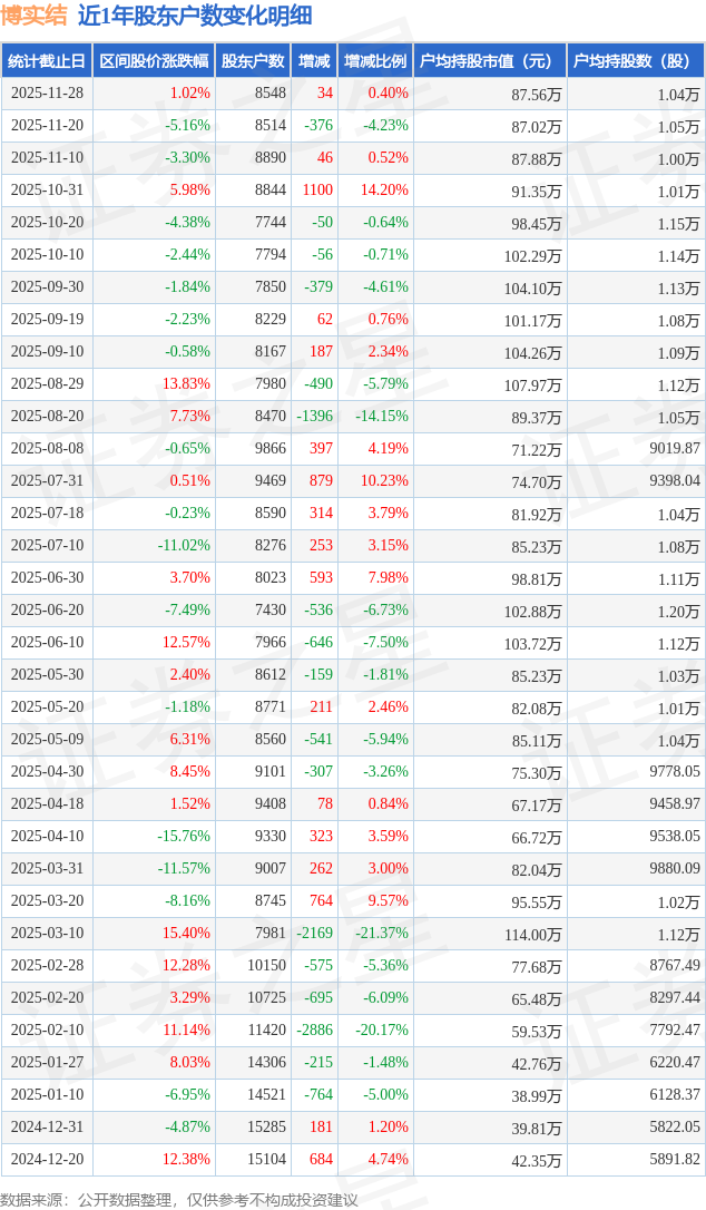 从股价来看,2025年11月20日至2025年11月28日,博实结区间涨幅为1.02%,在此期间股东户数增加34.0户,增幅为0.4%。