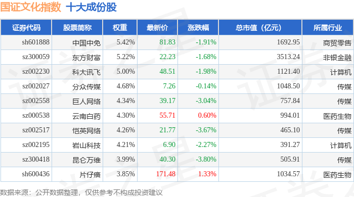 国证文化(399397)指数十大成份股详情如下: