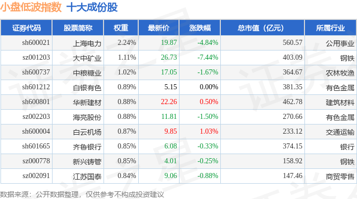证券之星消息,12月3日,小盘低波(399408)指数报收于15179.46点,跌0.09%,成交372.71亿元,换手率1.09%。当日该指数成份股中,上涨的有72家,国机重装以10.06%的涨幅领涨,下跌的有72家,大中矿业以7.44%的跌幅领跌。