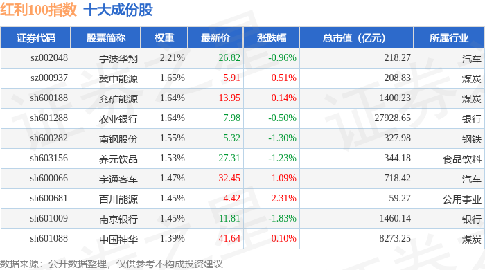 证券之星消息,12月3日,红利100(399411)指数报收于3527.29点,跌0.21%,成交366.92亿元,换手率0.31%。当日该指数成份股中,上涨的有39家,厦门象屿以3.69%的涨幅领涨,下跌的有58家,森马服饰以4.79%的跌幅领跌。