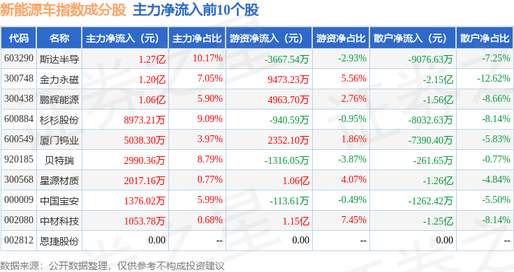 资金流向方面,新能源车(399417)指数成份股当日主力资金净流出合计50.42亿元,游资资金净流入合计10.26亿元,散户资金净流入合计40.3亿元。成份股资金流向详情见下表: