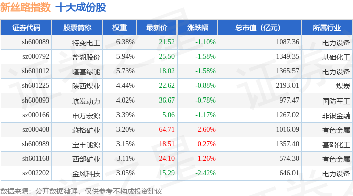 新丝路(399429)指数十大成份股详情如下: