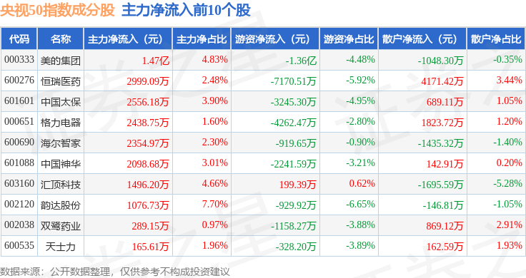 资金流向方面,央视50(399550)指数成份股当日主力资金净流出合计30.99亿元,游资资金净流入合计8.83亿元,散户资金净流入合计22.16亿元。成份股资金流向详情见下表: