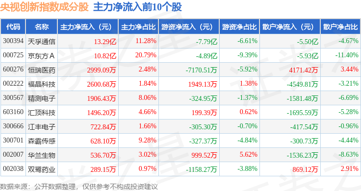 资金流向方面,央视创新(399551)指数成份股当日主力资金净流出合计5.79亿元,游资资金净流出合计8.19亿元,散户资金净流入合计13.99亿元。成份股资金流向详情见下表: