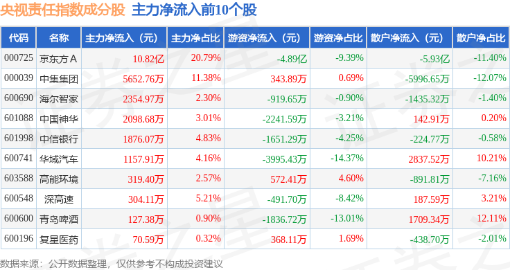 资金流向方面,央视责任(399555)指数成份股当日主力资金净流出合计13.93亿元,游资资金净流出合计6097.95万元,散户资金净流入合计14.54亿元。成份股资金流向详情见下表: