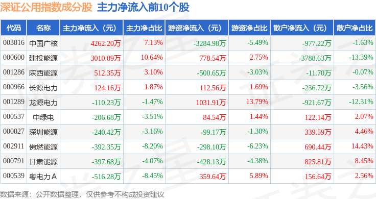 资金流向方面,深证公用(399622)指数成份股当日主力资金净流出合计1.54亿元,游资资金净流出合计302.91万元,散户资金净流入合计1.57亿元。成份股资金流向详情见下表: