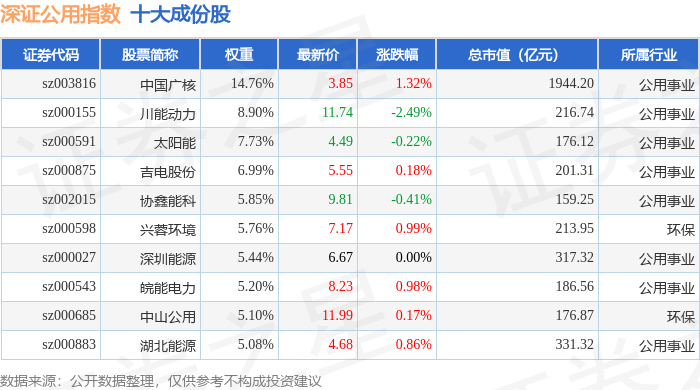 证券之星消息,12月3日,深证公用(399622)指数报收于1719.19点,涨0.27%,成交32.04亿元,换手率0.55%。当日该指数成份股中,上涨的有12家,建投能源以2.47%的涨幅领涨,下跌的有7家,川能动力以2.49%的跌幅领跌。
