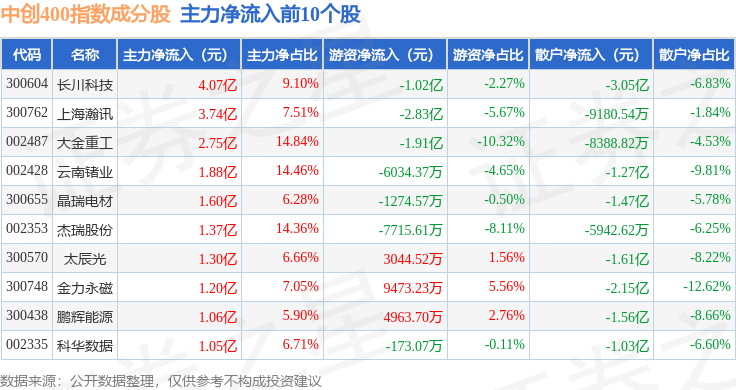 资金流向方面,中创400(399624)指数成份股当日主力资金净流出合计122.79亿元,游资资金净流入合计18.01亿元,散户资金净流入合计104.78亿元。成份股资金流向详情见下表: