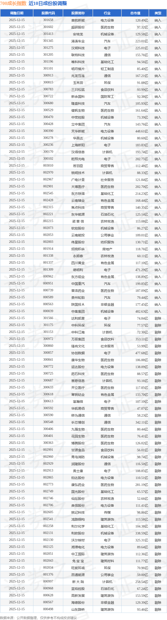 近10日内700成长(399628)指数成份股做了调整,新纳入了43只股票,剔除了43只股票。