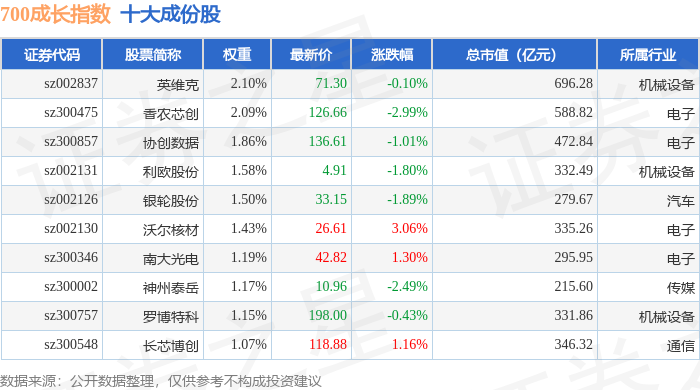证券之星消息,12月3日,700成长(399628)指数报收于2238.7点,跌0.76%,成交885.01亿元,换手率2.72%。当日该指数成份股中,上涨的有75家,利安隆以10.03%的涨幅领涨,下跌的有154家,新莱应材以8.84%的跌幅领跌。