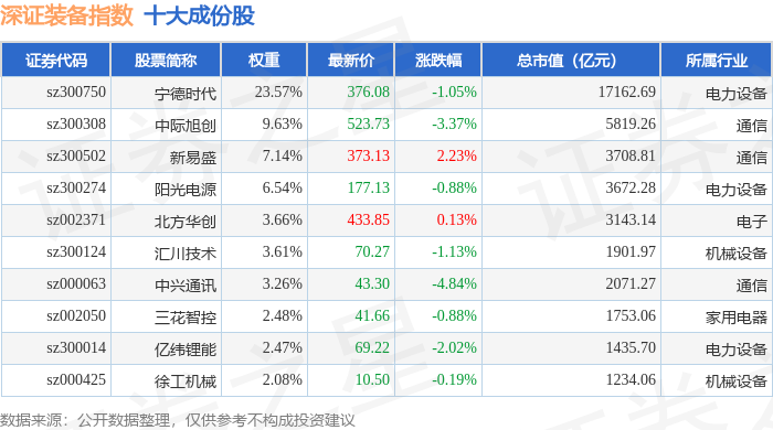 证券之星消息,12月3日,深证装备(399636)指数报收于7704.33点,跌0.87%,成交1359.71亿元,换手率2.57%。当日该指数成份股中,上涨的有22家,大金重工以10.0%的涨幅领涨,下跌的有58家,中兴通讯以4.84%的跌幅领跌。
