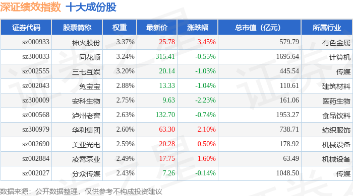 深证绩效(399655)指数十大成份股详情如下: