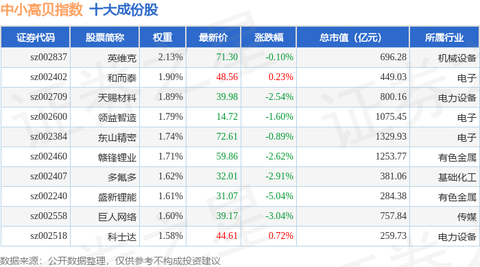 中小高贝(399664)指数十大成份股详情如下: