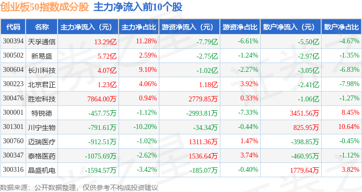 资金流向方面,创业板50(399673)指数成份股当日主力资金净流出合计61.08亿元,游资资金净流入合计19.67亿元,散户资金净流入合计41.41亿元。成份股资金流向详情见下表: