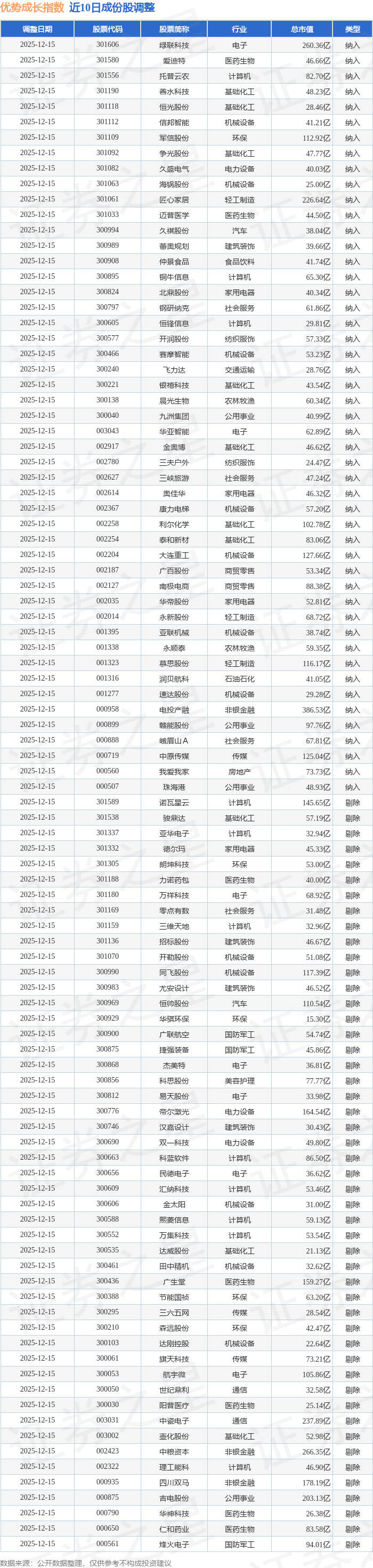 近10日内优势成长(399698)指数成份股做了调整,新纳入了49只股票,剔除了49只股票。