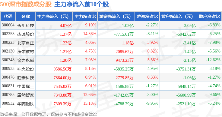 资金流向方面,500深市(399802)指数成份股当日主力资金净流出合计74.55亿元,游资资金净流入合计11.46亿元,散户资金净流入合计63.09亿元。成份股资金流向详情见下表: