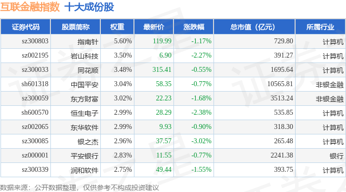 证券之星消息,12月3日,互联金融(399805)指数报收于3587.45点,跌2.0%,成交296.02亿元,换手率1.1%。当日该指数成份股中,上涨的有1家,新力金融以5.59%的涨幅领涨,下跌的有61家,生意宝以5.09%的跌幅领跌。