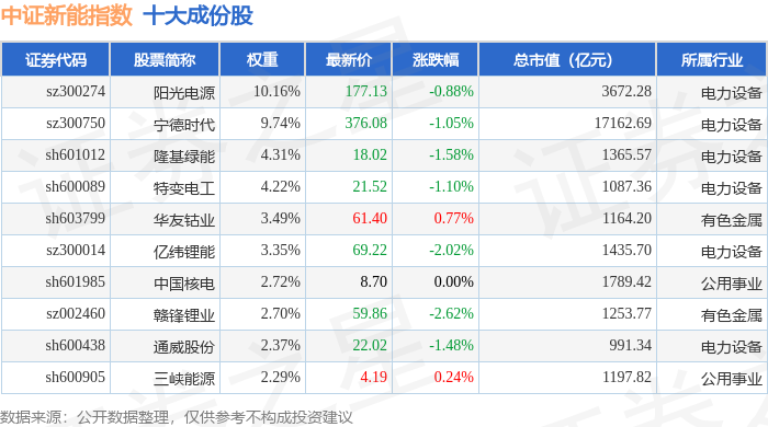 证券之星消息,12月3日,中证新能(399808)指数报收于2722.98点,跌1.27%,成交783.38亿元,换手率1.22%。当日该指数成份股中,上涨的有17家,大金重工以10.0%的涨幅领涨,下跌的有61家,中矿资源以6.53%的跌幅领跌。