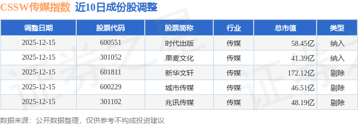 近10日内CSSW传媒(399810)指数成份股做了调整,新纳入了2只股票,剔除了3只股票。
