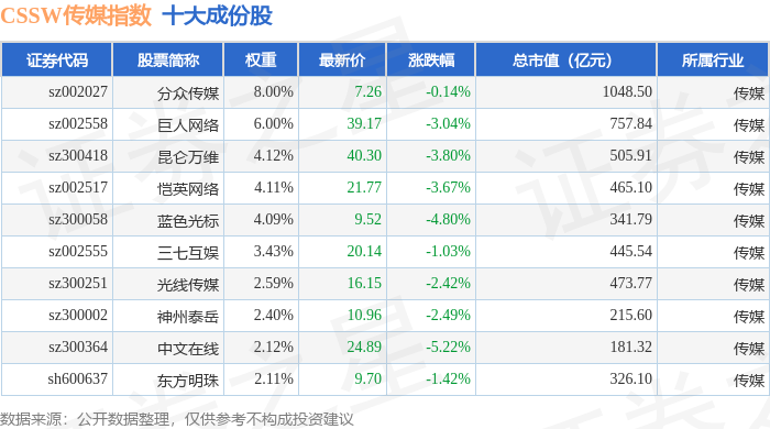 CSSW传媒(399810)指数十大成份股详情如下: