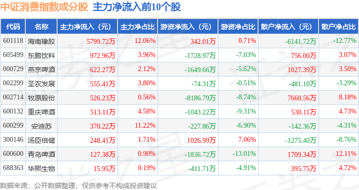 资金流向方面,中证消费(399932)指数成份股当日主力资金净流出合计17.12亿元,游资资金净流入合计5.0亿元,散户资金净流入合计12.12亿元。成份股资金流向详情见下表: