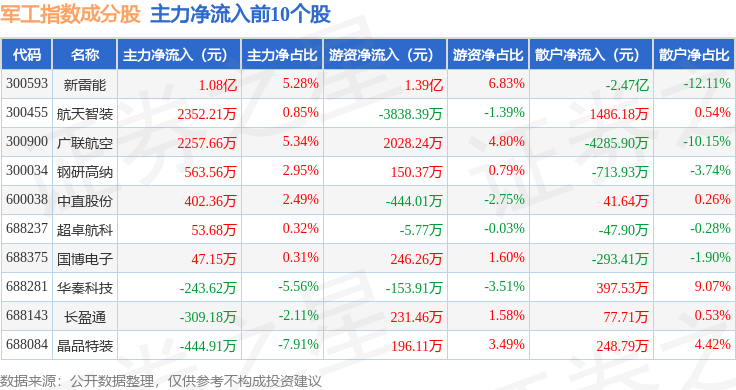资金流向方面,军工指数(399959)成份股当日主力资金净流出合计21.58亿元,游资资金净流入合计7.31亿元,散户资金净流入合计14.27亿元。成份股资金流向详情见下表: