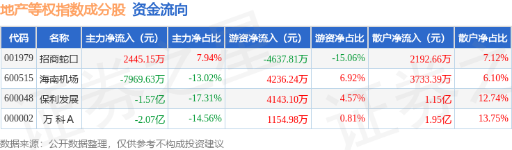 资金流向方面,地产等权(399983)指数成份股当日主力资金净流出合计4.19亿元,游资资金净流入合计4896.51万元,散户资金净流入合计3.7亿元。成份股资金流向详情见下表: