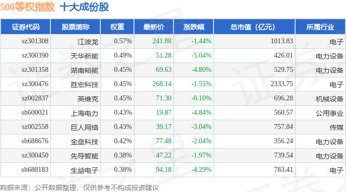 500等权(399982)指数十大成份股详情如下: