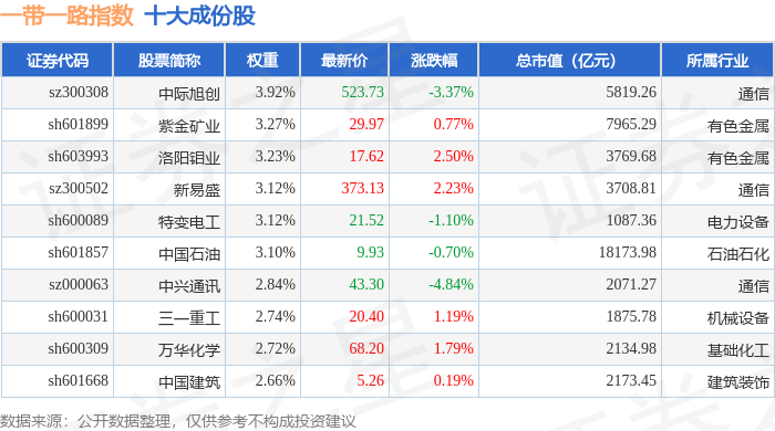证券之星消息,12月3日,一带一路(399991)指数报收于2799.63点,涨0.09%,成交1308.27亿元,换手率0.66%。当日该指数成份股中,上涨的有44家,杰瑞股份以10.0%的涨幅领涨,下跌的有41家,中矿资源以6.53%的跌幅领跌。